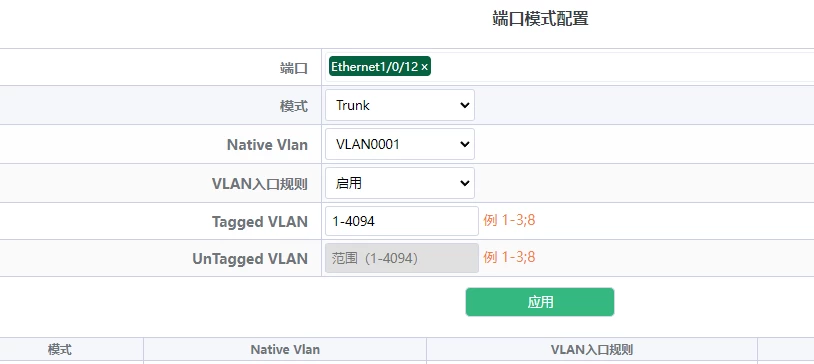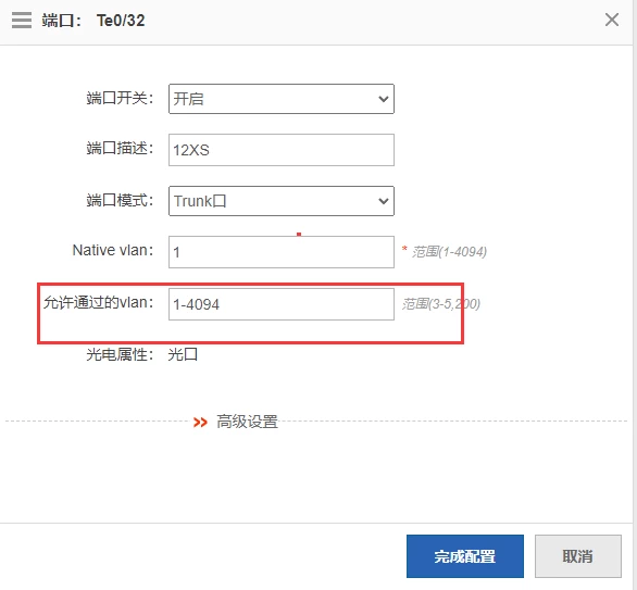 2、其他品牌交换机为12口,设置12口为trunk ,如下图。